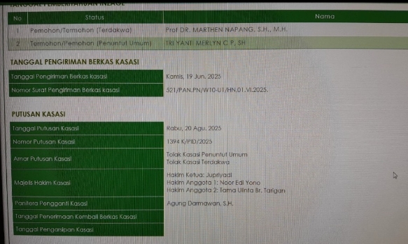 Penolakan kasasi dengan nomor 1394/K/PID/2025 tertanggal 20 Agustus 2025 tersebut, disampaikan oleh tiga hakim MA yakni, Jupriyadi (Hakim Ketua) bersama dua anggota Noor Edi Yono dan Tama Ulinta br. Tarigan. Amar putusannya menyatakan, menolak kasasi Penuntut Umum (Termohon/Pemohon) dan menolak kasasi Terdakwa (Prof. Dr. Marthen Napang, SH., MH).