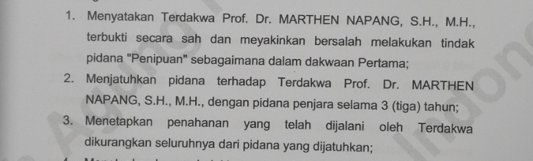 Dalam putusan kasasi nomor: 1394 K/Pid/2025 tertanggal 20 Agustus 2025, Ketua Majelis Hakim Jupriyadi, SH., M.Hum, dengan anggota Dr. Tama Ulinta br Tarigan, SH., M.Kn., dan Noor Edi Yono, SH., MH., menyatakan, menolak permohonan kasasi atas nama Prof Dr. Marthen Napang.
